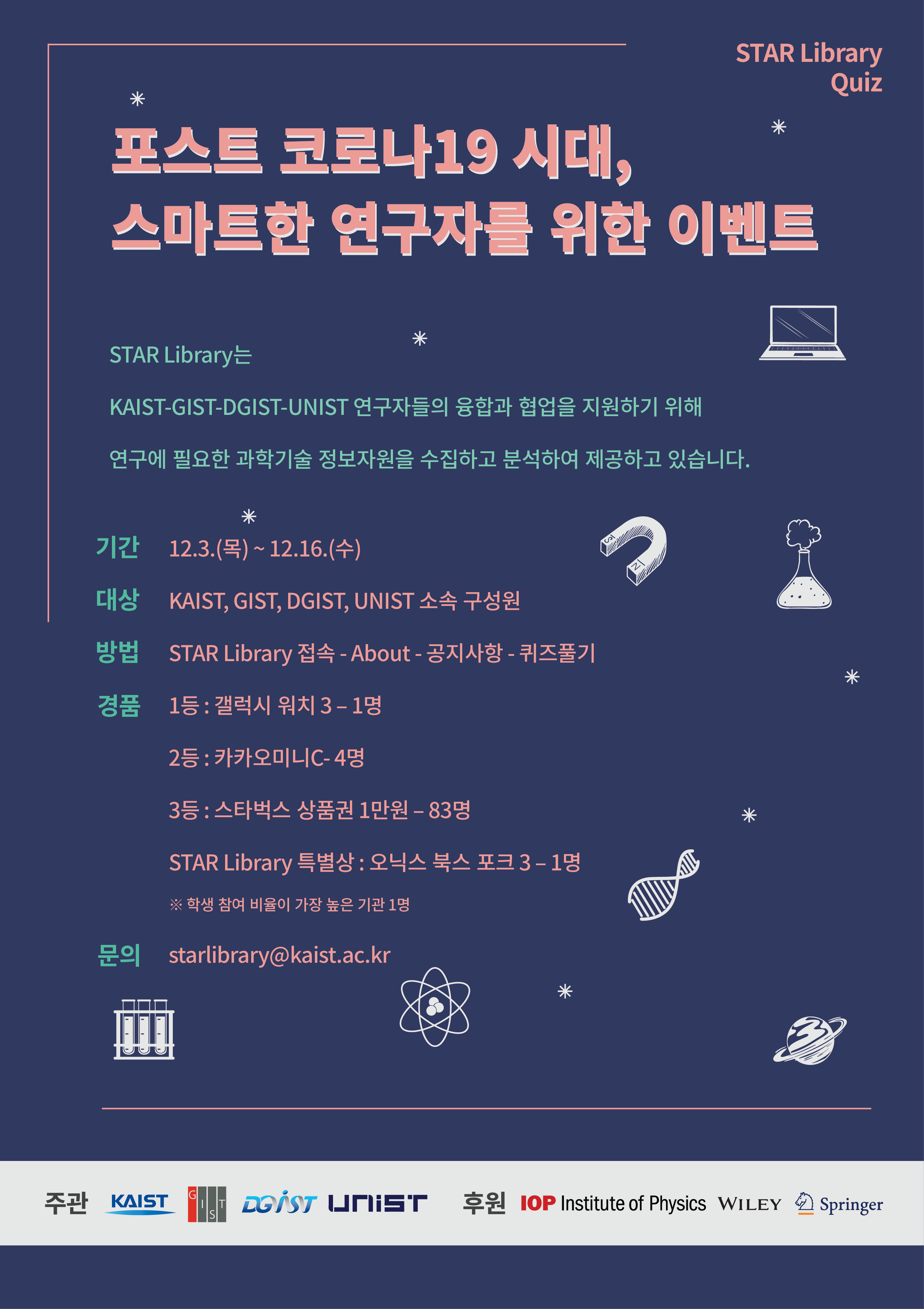 ● 방법 : 1. 퀴즈 바로가기 : http://ksurv.kr/?b=15299 (10분 내외로 풀 수 있습니다^^) 2. STAR Library, IOP, Wiley, Springer e-Book 관련 퀴즈를 풀고 개인정보 입력