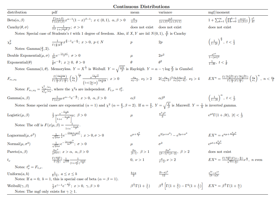 아래 그림은 다른 연속적인 분포를 가지는 pdf에 대해서 정리한 것이다. 잘 보이지 않는다면 클릭해서 확대해서 보는 것을 추천한다.