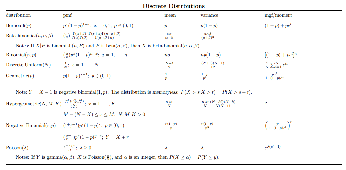 위 그림에 포아송 분포는 없다. 그 이유는 포아송 분포는 불연속함수이기 때문에 pdf를 가지지 않고 pmf를 가진다. 아래 그림은 불연속 분포를 가지는 pmf를 정리한 것이다.